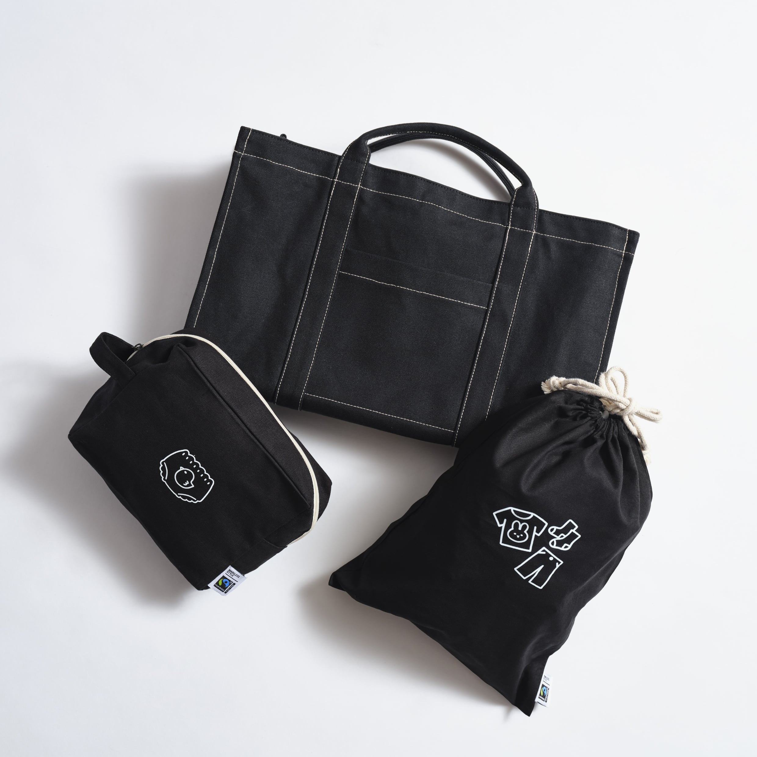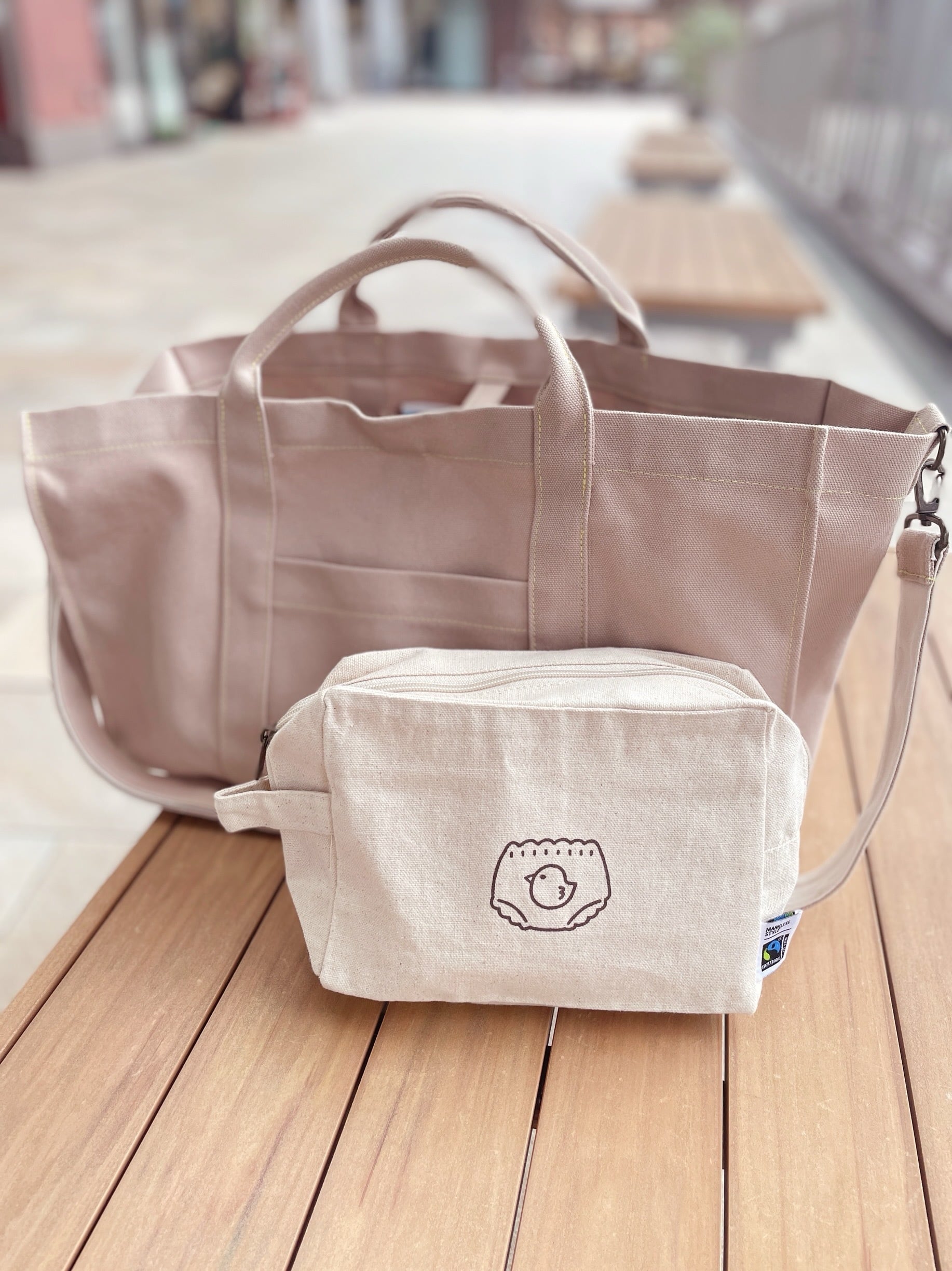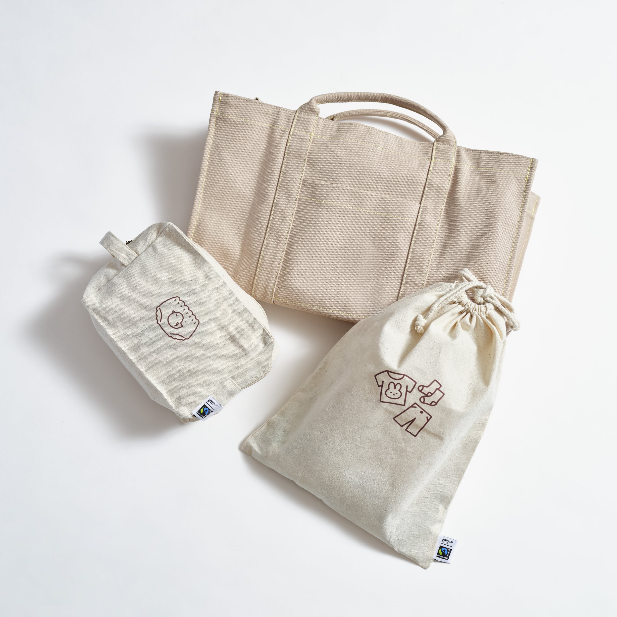 オリジナルポーチは、国際フェアトレード認証ラベル付きの、オーガニックコットンを使用しています。