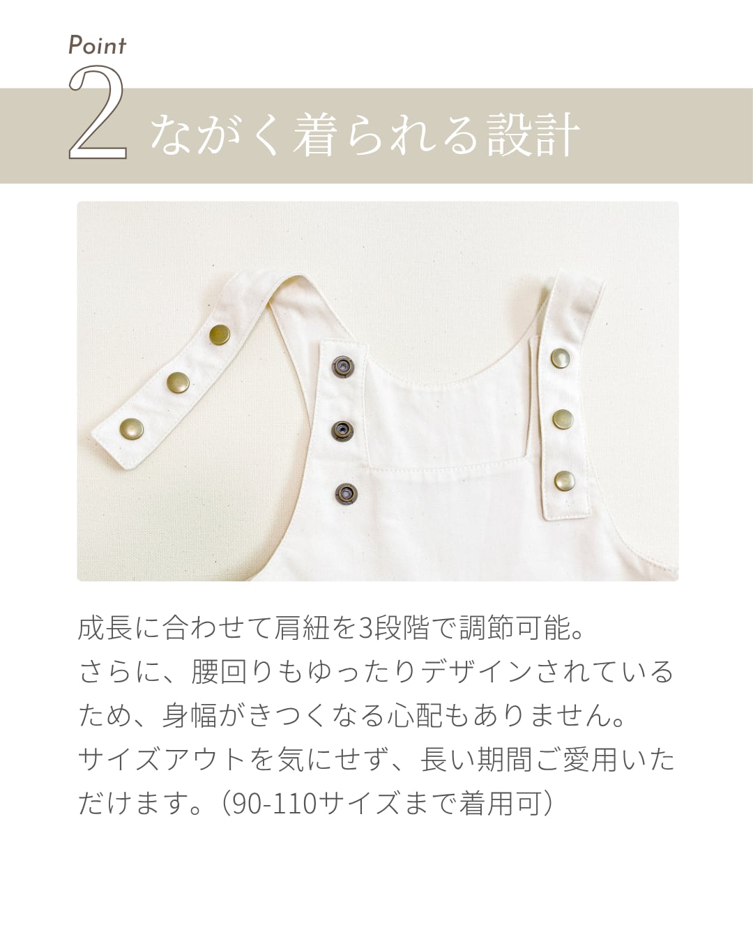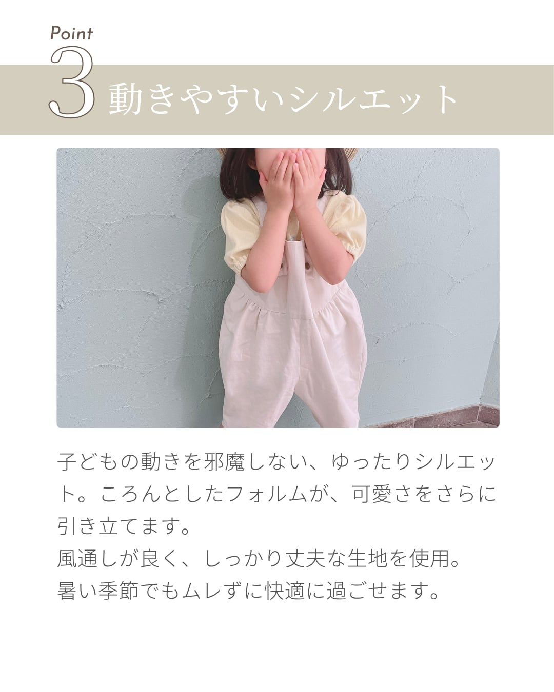 サロペットが選ばれる理由は、やはりその見た目の可愛らしさ。少しだけぽってりとした愛らしいシルエットにこだわりました。