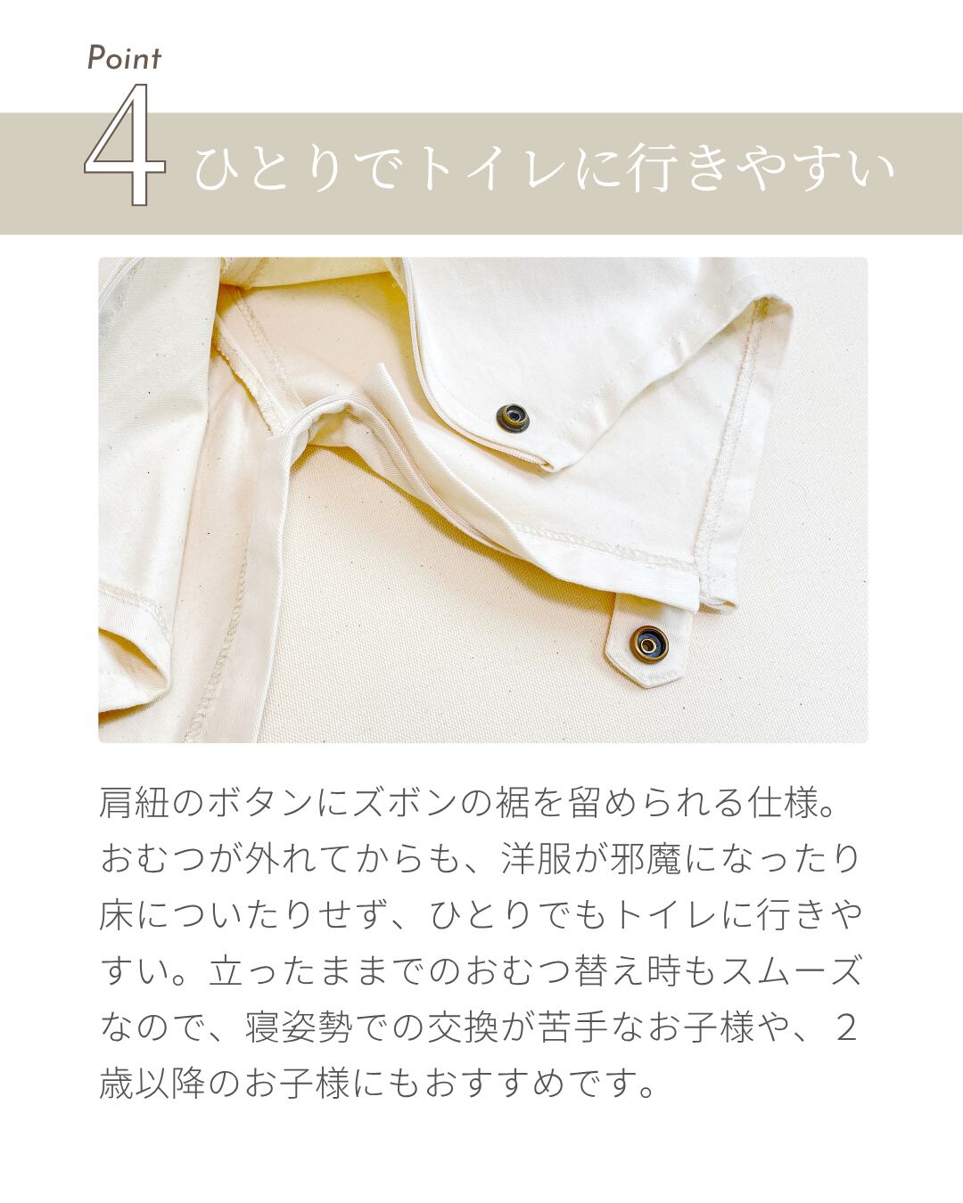 この経験を基に、様々な事情でおむつ替えに負担を抱えるママを少しでも楽にできる商品を作りたいと思い「楽するサロペット」ができました。